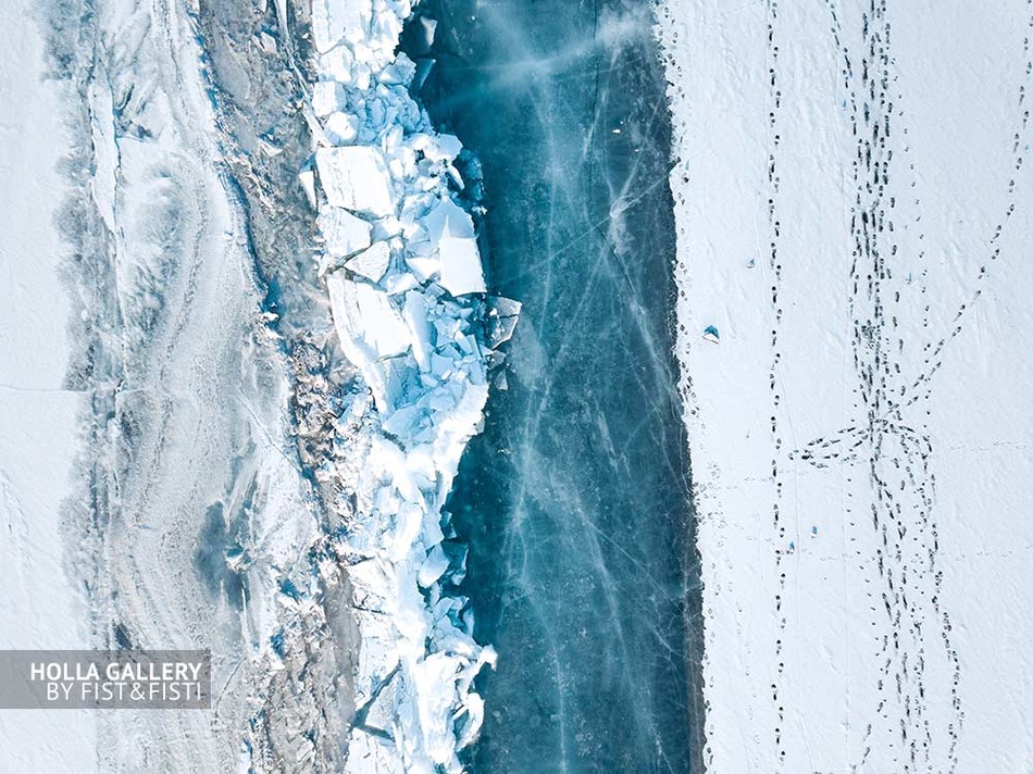 Фотография Байкала на коптер сверху. Граница моря и берега. Глубокий лёд Байкала. Фотокартина. Постер для интерьера