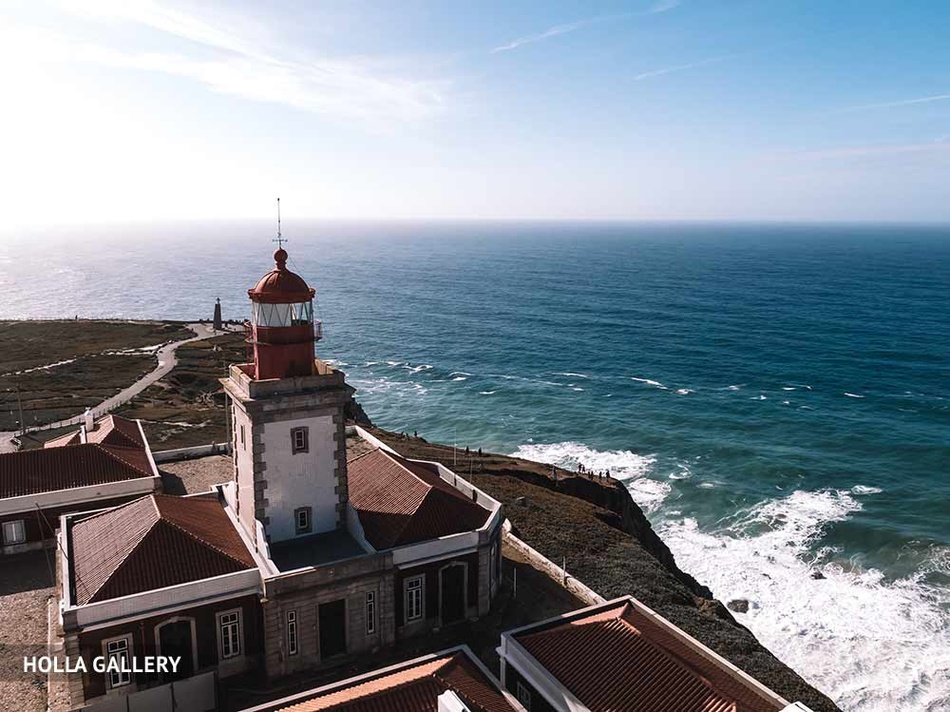Прибрежные волны на закате у мыса Назаре в Португалии. Облака и следы от самолета