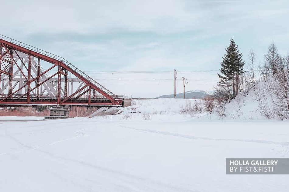 Заснеженная река и железнодорожный мост над притоком Байкала. Заказать фотографию в офис